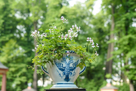 Geranium plant with red flowers grows in pot on white background. Ceramic vase in cottage style. Garden design.