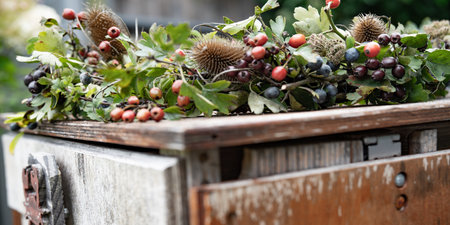 Decorative wreath with autumn berries in a basket. Colorful, homemade wickerwork made from seasonal berries and shrubs on wooden table. Floristry for autumn and thanksgiving.
