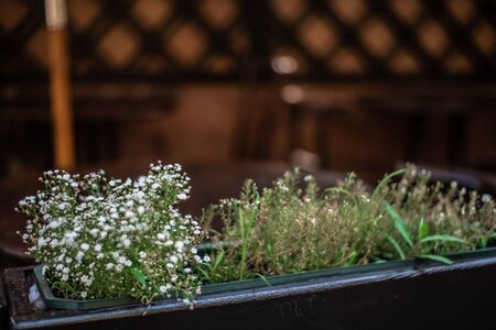 Orange flowers in pots outdoor on the balcony with blurred background. Beautiful small flowers blooming in flower pot. Blooming flowers on a sunny day. Outdoor garden. Home plants.