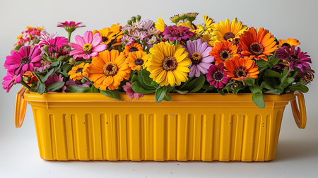 A yellow container brimming with a variety of vibrant and colorful flowers, creating a lively and colorful display.