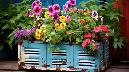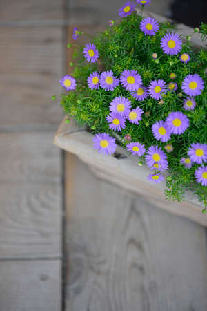 A wooden planter holds clusters of small purple flowers, resting on a weathered surface. The scene captures nature's beauty in a simple, charming way.