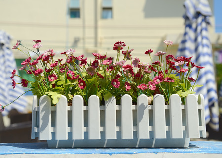 Close-up of a concrete pot with colorful verbena flowers on a windowsill in Lublin, Poland