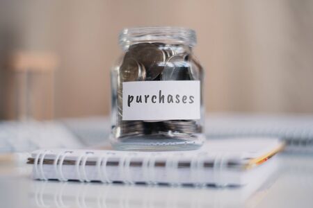 Savings concept for purchases - Glass jar with coins and inscription. Close up.