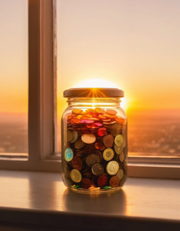 AI Generated. Glass Jar with Stacked Coins and Natural Light