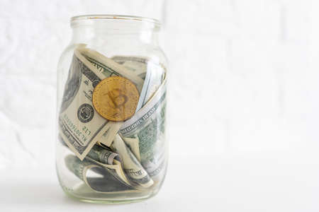 Bitcoin bronze gold coin in glass jar on white background. A set of cryptocurrencies with real dollars in a glass jar. Savings, investments, financial risk concept