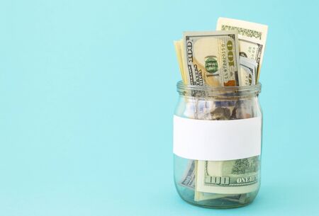 Money in a liter jar on a blue background. On the bank there is a white sticker for inscription. American dollars are in the piggy bank. The concept of business, finance. There is a place for text.