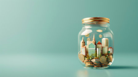 A glass jar containing a miniature cityscape symbolizes urban growth and financial savings in a unique and artistic way.