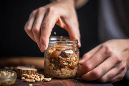 A glass jar with nuts and honey on a light blue background. A natural nourishing remedy.