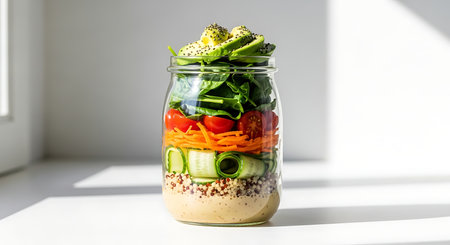 Healthy layered salad in a jar with fresh vegetables and dressing perfect for meal prep