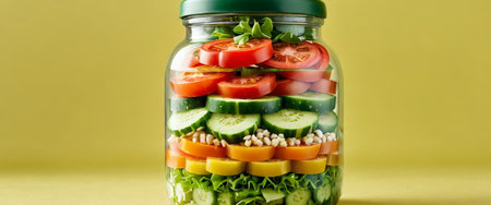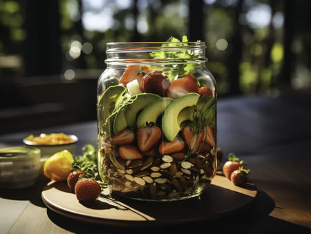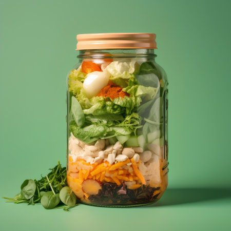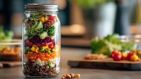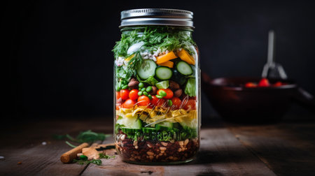 A mason jar filled with a salad sitting on top of a table. AI generative image.