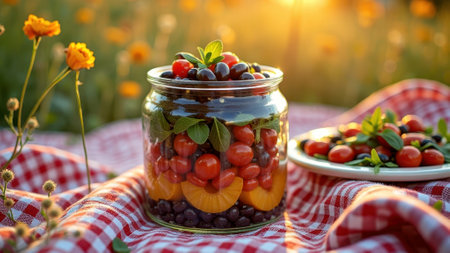 Fresh fruit and berry salad in jar with sunset picnic setting. That the image is generated using AI.