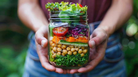 A person hands holding a mason jar salad with layers of greens, veggies, and chickpeas.