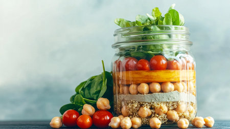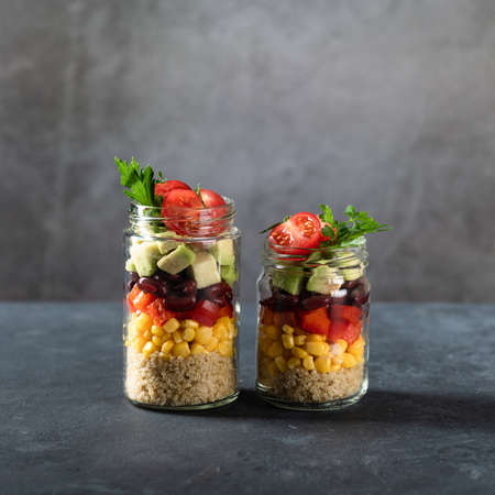 Healthy salad with quinoa, tomato, cucumber, bell pepper and chickpeas in glass jar