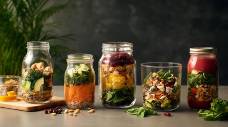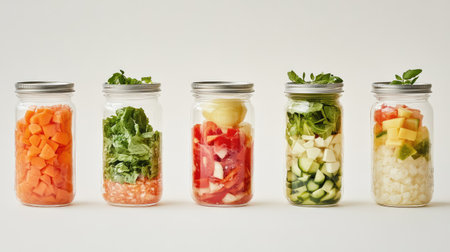 A vibrant arrangement of five glass jars filled with a variety of fresh vegetables, perfect for meal preparation and healthy eating. Each jar showcases colorful ingredients ideal for salads or healthy dishes.