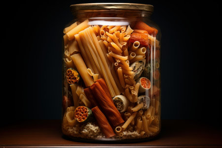 two types of pasta in separate glass jars against a white wall, created with generative ai