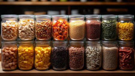 Organized jars of colorful ingredients displayed on shelves in a kitchen for meal preparation and cooking. Generative AI