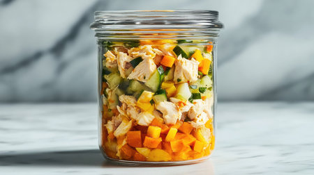 Close-up of gourmet chicken salad in a glass container with marble background, showcasing colorful layers