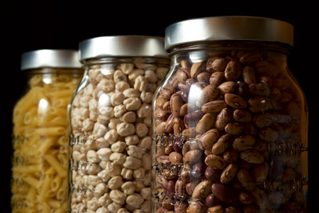 A vibrant display of jars filled with various types of beans, showcasing colorful ingredients ideal for cooking and healthy meals. Perfect for kitchen decor.