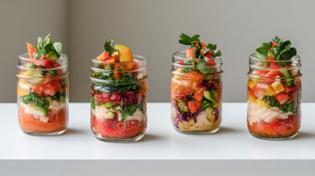 Enjoy fresh and vibrant salad jars filled with layers of colorful vegetables and fruits, perfect for meal prep or a healthy snack option.
