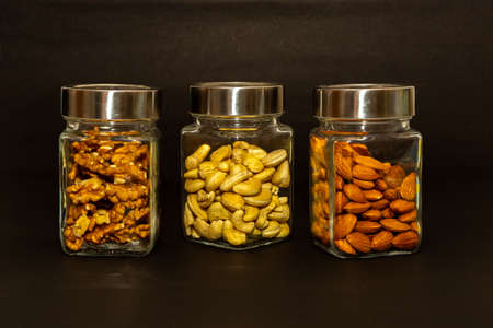 Glass jars filled with walnuts, cashew nuts and almonds displayed with black background