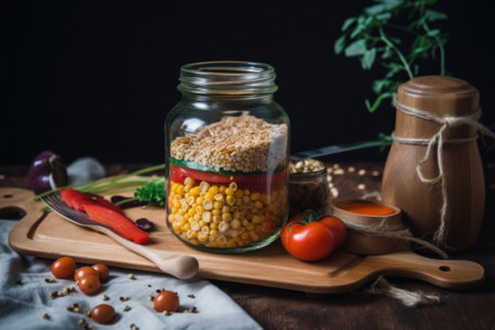 A jar filled with corn and tomatoes on a cutting board. AI generative image.