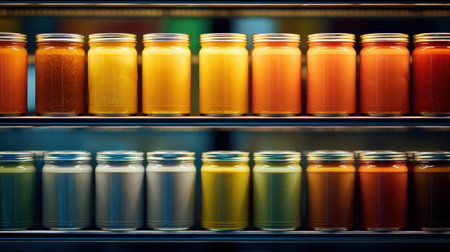 Brightly colored jars of various canned foods are neatly arranged in rows on a shelf, illuminated by a warm backlight, creating a cozy atmosphere.