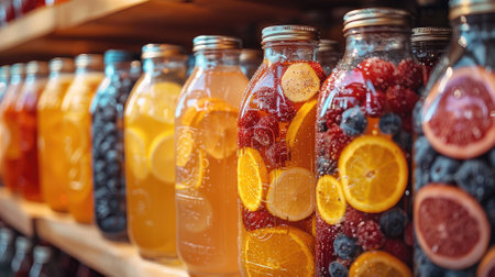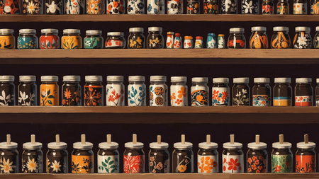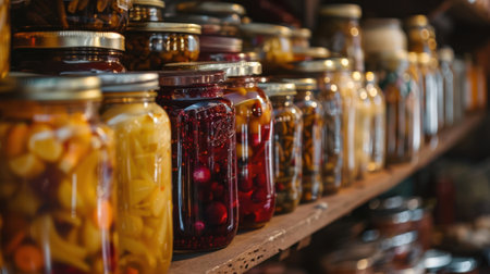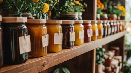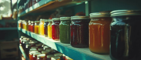 A shelf lined with jars of homemade jams in different flavors, with rustic labels, symbolizing tradition, homemade goods, and culinary passion.