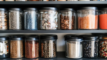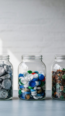 A vertical, tall 9:16 editorial image capturing three clear glass jars categorized with separated re