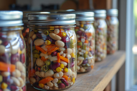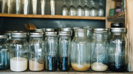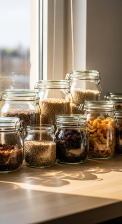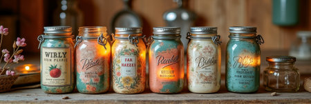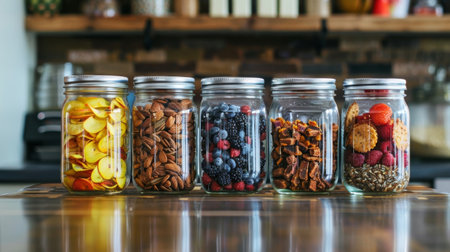 A set of recycled glass mason jars filled with locallysourced snacks promoting sustainable and ethical food choices.