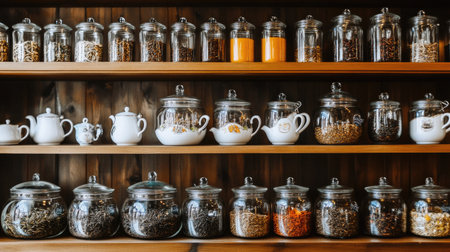 A beautiful arrangement featuring glass jars filled with various herbs, spices, and teas, set on a wooden shelf, ideal for home organization and aesthetics.