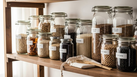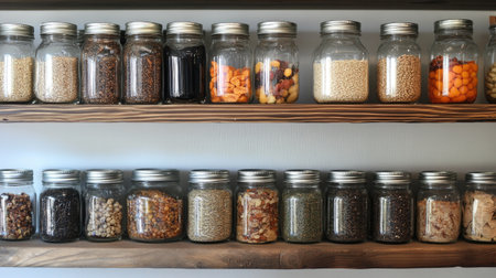 A wooden shelf displays numerous glass jars containing various grains and legumes. The composition highlights the textures and colors of the ingredients, from light beige to dark brown, illuminated by soft natural light. This setup suggests a clean, organized kitchen or pantry. Suitable for illustrations about food, storage or lifestyle topics.