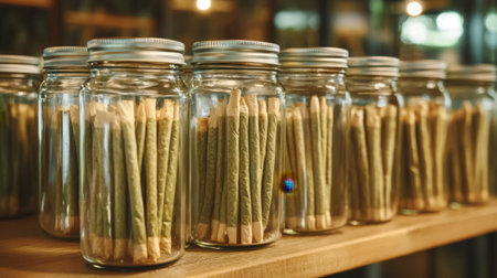 Glass Jars with Neatly Packed Pre Rolled Cannabis. High quality photo