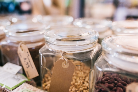 Glass jars with bean crown vetch and peas in a shop with natural organic food.