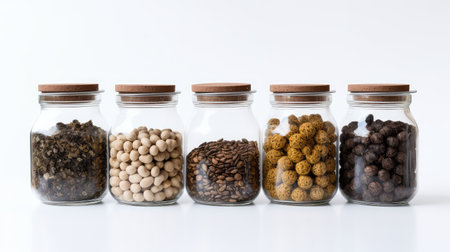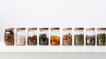 a row of glass jars with different spices and herbs inside them on a white background.igh resolution AI generated