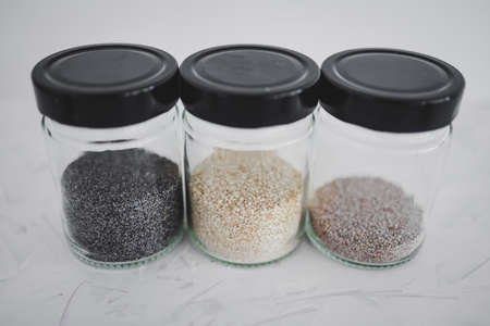 simple food ingredients concept, seed jars with sesame poppy pupmkin chia and flax seeds as important nutrient sources for nutrition shot on white background