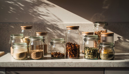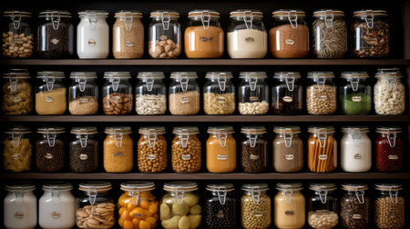 jars kitchen flat lay illustration containers shelves, pasta rice, cereal organized jars kitchen flat lay