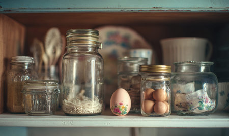 A shelf with a variety of jars and a small egg. The egg is in a jar with a floral design