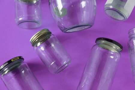 Transparent glass jars with lids isolated on purple background, top view flat lay recycling concept for environmental awareness. Segregated recyclables mock up conceptual idea, junk waste disposal