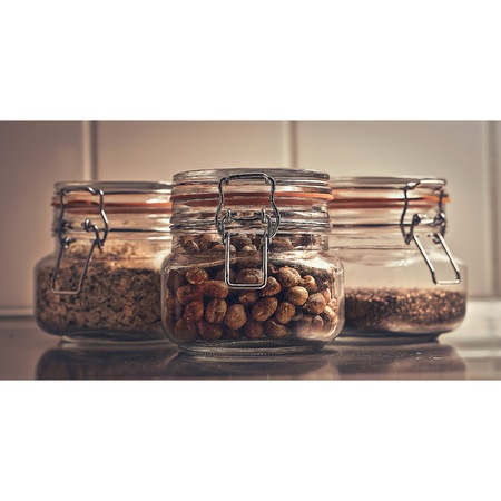 Glass jars with cereals and grains on a shelf in the kitchen