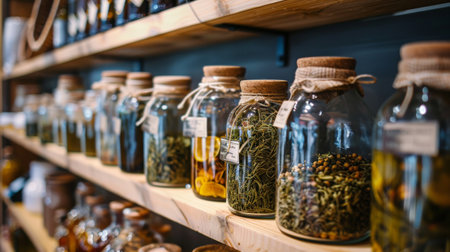 A wooden shelf displays an array of glass jars containing different dried herbs. The warm ambiance reflects the cozy atmosphere of a rustic cabin, inviting exploration.
