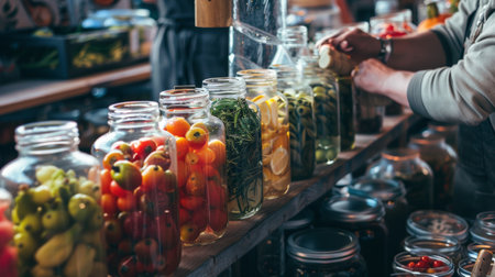 Colorful pickled vegetables in glass jars lined up at a market stall. The vibrant and detailed image highlights themes of preservation, market, and fresh produce.