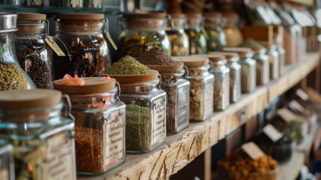 A selection of jars filled with various spices and herbs neatly arranged on wooden shelves in a store. The display showcases an array of colors and textures, enhancing the natural appeal.