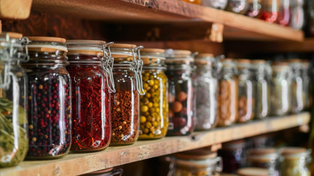 A variety of spices stored in glass jars with metal clasps, neatly arranged on a rustic wooden shelf, creating a warm and inviting kitchen atmosphere.