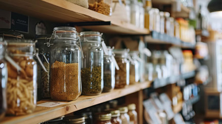 Generative AI : Biodegradable vegan shop for buying eco bio goods glass jar pack on shelf Trendy living life in SME startup store go green market refill bulk shop for reduce climat
