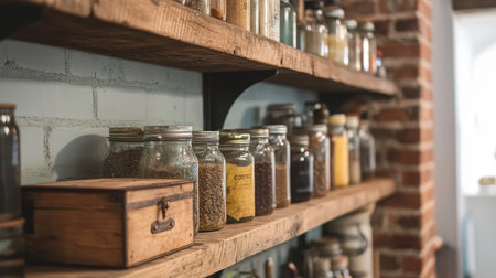 Discover a charming kitchen scene featuring rustic wooden shelves lined with various spice jars, capturing a cozy and organized culinary space.