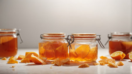 Orange jam in a glass jar on a light background, selective focus