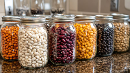 A vibrant assortment of dried beans in different colors and patterns, including red, white, and black beans, arranged in clear glass jars on a kitchen counter.