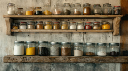 Assorted spices stored in glass jars arranged on wooden shelves, showcasing a rustic and organized kitchen scene. Perfect for kitchen, cooking, and rustic themes.
