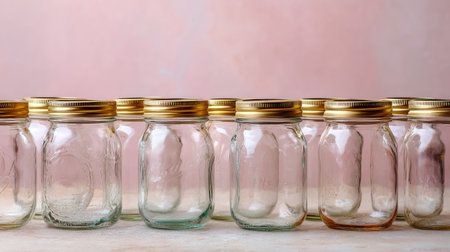 A collection of empty glass jars positioned neatly against a soft pink background, ideal for various creative uses in home decor, storage solutions, or DIY projects.
