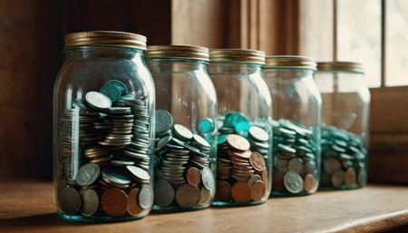 A collection of jars filled with coins and dollar bills, arranged on a table to depict themes of savings, financial planning, and budgeting in a cozy home setting.